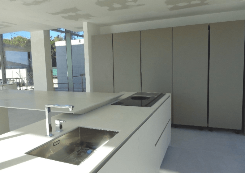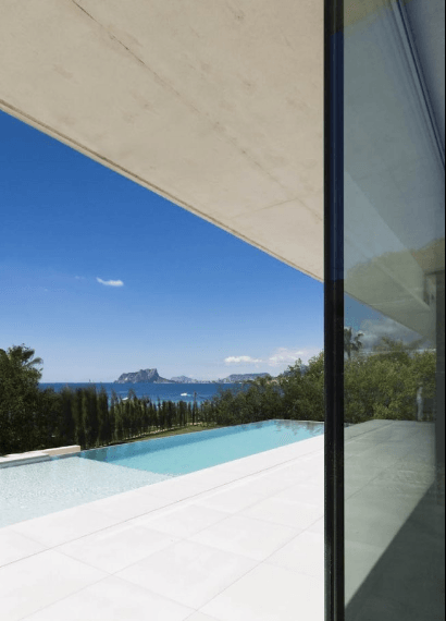 Die Villa verfügt über ein geräumiges und helles Untergeschoss mit Doppelgarage und Platz für ein Fitnessstudio, ein Heimkino oder ein Gästeapartment. Eine moderne Betontreppe mit Glasverkleidungen und Eichenholzstufen führt Sie rund um den Innenhof ins Erdgeschoss. Dieser helle und geräumige Bereich besteht aus dem Wohnzimmer mit einer Designerküche inkl. Kochinsel. Die speziellen Rahmen der großen Glasscheiben und Schiebetüren bieten Zugang zum Infinity-Pool mit Meerblick.